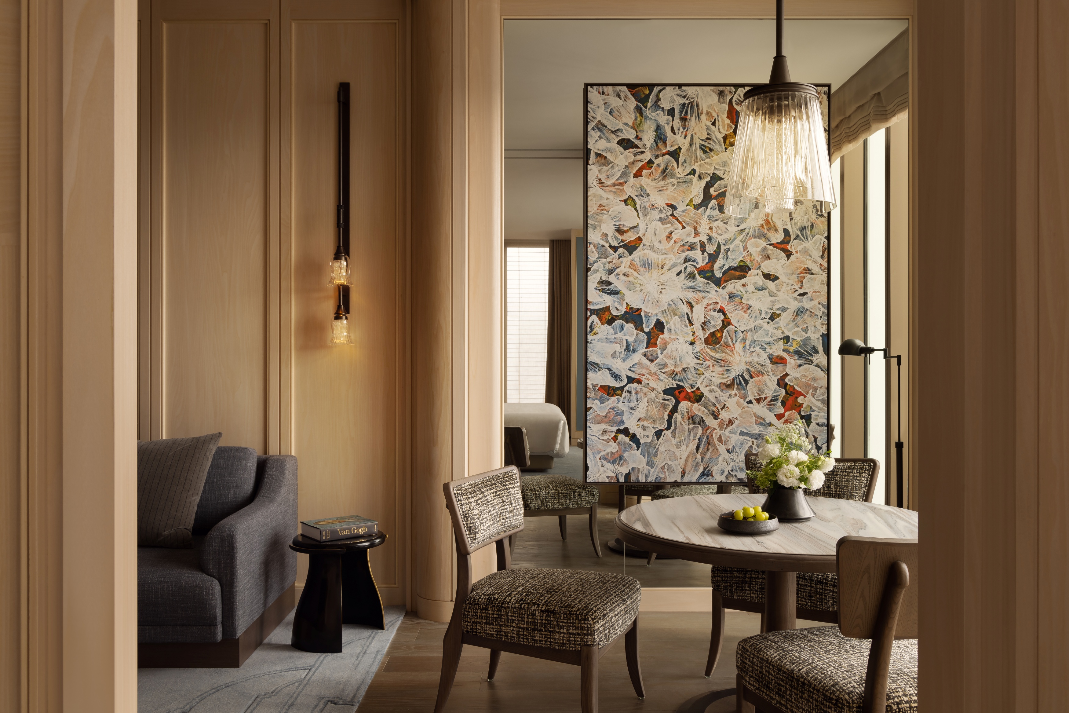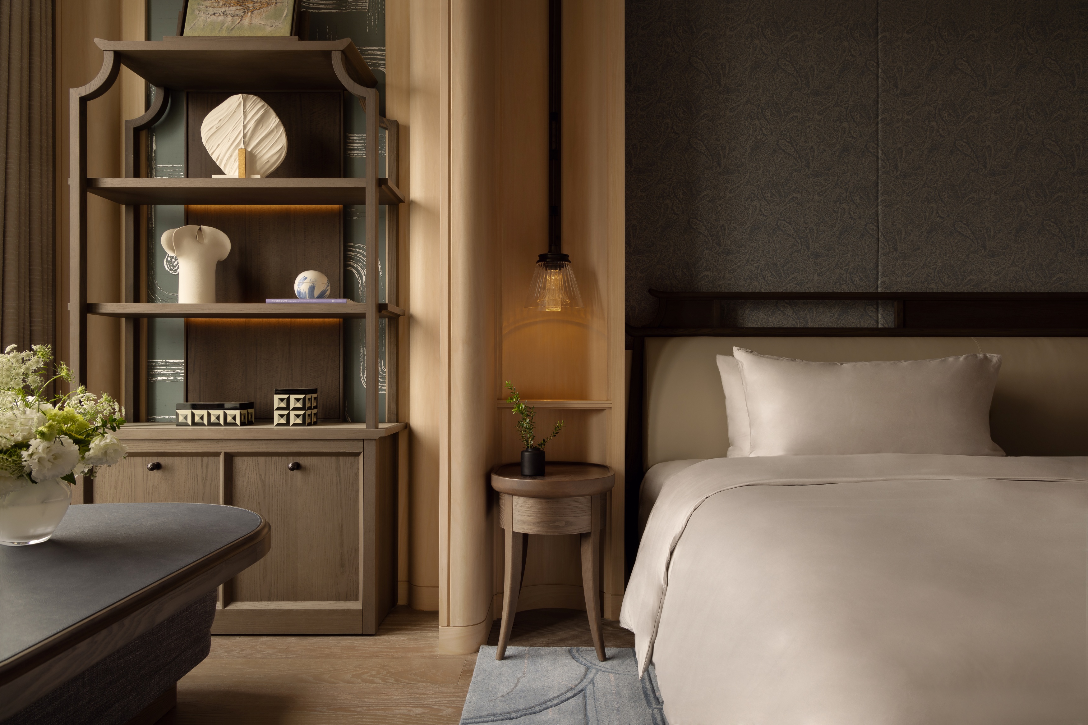 Exquisite silk panels, each meticulously hand-painted and adorned with silver gilt, emerge from a collaboration between British artisan De Gournay and Andre Fu Living, juxtaposing Art Deco geometries with zen garden serenity. This artistic sensibility extends to distinctive marquetry patterns adorning entrance doors, tableware, and carpets. A handful of accommodations also feature private balconies or spacious al fresco terraces with an outdoor dipping pool.